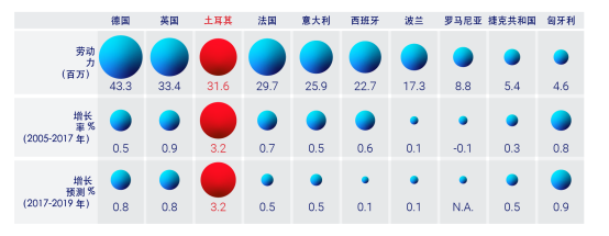 土耳其的劳动力约为 3160 万人,这使得土耳其成为欧洲第三大劳动力市场。土耳其的年轻人口是劳动力增长的重要促成因素,提升了该国的地位,超过了其竞争对手。与欧盟国家相比,土耳其的劳动力增长最快。