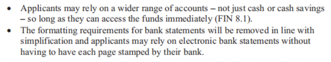 生活费存放时间缩短,附属申请人生活费标准降低,无纸化文件及可以使用广泛账户1、如果持有学生,技术工人,公司内部员工,初创企业和创新者签证类型者,如果他们在英国居住超过12个月,无需满足生活费要求;2、申请人可以依靠电子银行对账单,而不必在每页上盖章;3、申请人将能够依靠更广泛的账户(而不仅仅是现金或现金储蓄),只要可以立即使用资金;4、大多数申请人需要在申请之日起31天内提交证据。新的政策对于生活费存放要求降低为连续28天,大大缩短了原来90天的要求,但金额不少于1,270英镑。对于伴侣附属人生活费求从630英镑降低至285英镑,第一个孩子生活费为315英镑,其后每个孩子200英镑,清楚的让申请人知道了具体财务数字。无纸化的电子票据可以不用每页盖章就可以使用,大大节省了申请人的时间。除了现金和储蓄账户,还可以使用更多的其他账户来方便申请人规划自己的资金。特别是对于已经在英的创新签证申请者只要超过12个月他们不需要提供任何证据来证明他们符合财务要求。也使得申请更为简便。