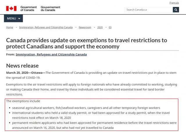 加拿大政府更新豁免入境信息!持有学签、工签、已经获批的永久居民签证可以入境!