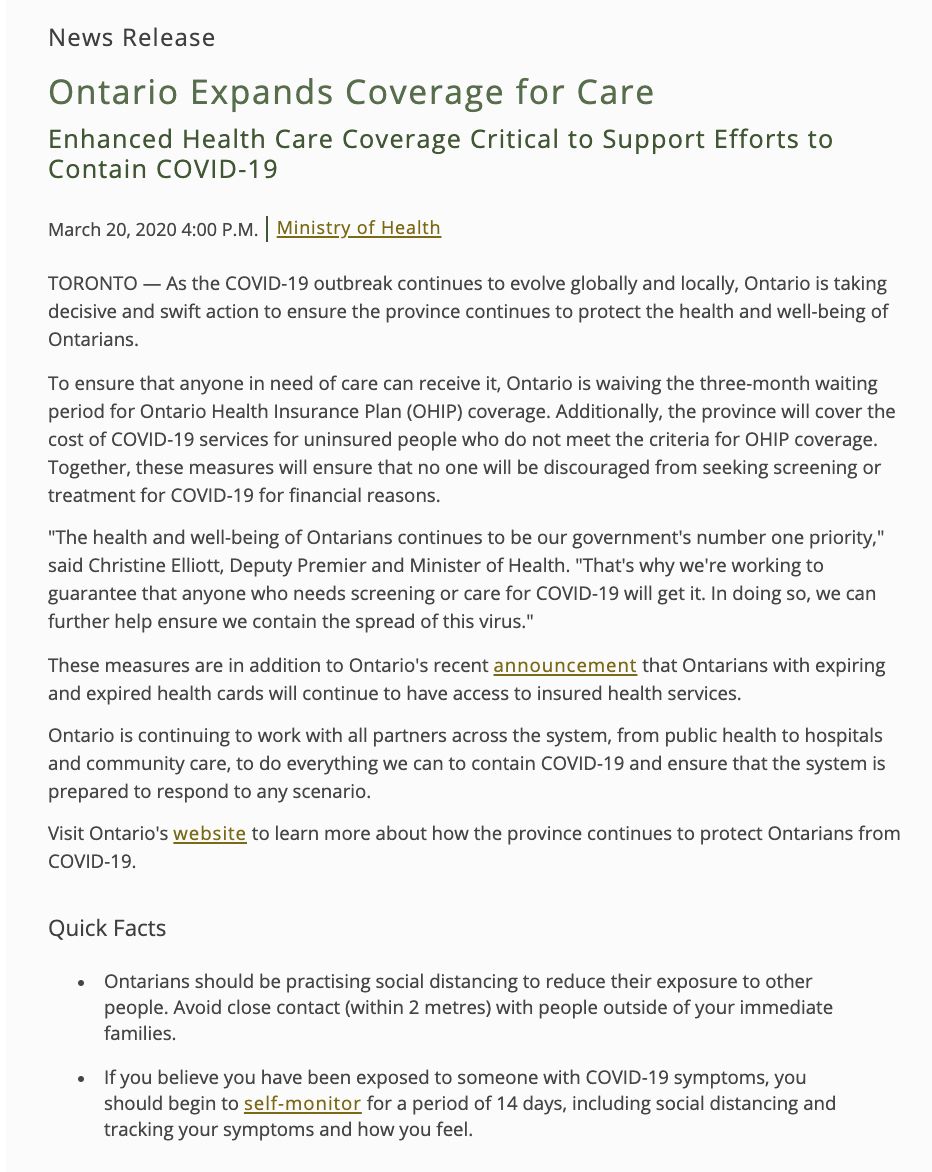 3月20日,安省卫生厅发布了一则消息,宣布省政府承担所有人治疗新冠肺炎的费用,不论您在安省是什么身份,也就是说,持有访问和学生签证的人士也会得到免费治疗。随着COVID-19疫情在全球和本地的持续发展,安大略省正在采取果断而迅速的行动,以确保继续保护安大略人的健康。为了确保任何需要的人都能得到治疗,安大略省免除了三个月的安大略省健康保险计划(OHIP)等待期。此外,该省将为不符合OHIP覆盖标准的未参保人群支付COVID-19服务的费用。总之,这些措施将确保不会因经济原因而阻止任何人寻求针对COVID-19的筛查或治疗。卫生部长克里斯蒂娜·埃利奥特(Christine Elliott)表示:“安大略人的健康和福祉仍然是我们政府的头等大事。” “这就是为什么我们正在努力确保需要筛查或治疗COVID-19的任何人都能得到它。这样做,可以进一步确保我们遏制这种病毒的传播。”