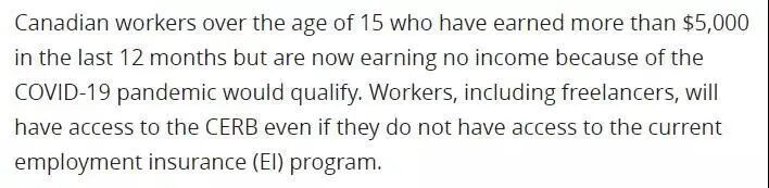 最新的补助金方案将给因新冠疫情导致零收入的工人提供每月$2000加币的补贴,为期4个月,最多$8,000加币。包括: 1、有条件领取失业保险(EI)的工人; 2、没有资格获得EI福利的的人,例如自雇人士(self-employed)以及被暂时解雇的工人。 加拿大参议院预计将在今天下午批准该法案。新的福利政策有望在4月6日开始实施。受影响的工人将可以填写网上申请表,并在申请后的10天内收到补助金。这意味着符合要求的受影响工人,最快能在4月中旬收到这笔补助金。特鲁多还宣布,国会已经正式通过了「联邦援助计划」,总金额达到 1070亿 。 为了遏制病毒在全国范围内蔓延,国会原本已于3月13日休会到至少4月20日。但为处理此项立法(包括救助计划),国会于昨日被紧急召回。 经过一整天的紧张谈判、辩论、提问以及投票,今日凌晨,加拿大联邦政府获得一致同意,通过了针对COVID-19危机的紧急立法,赋予联邦政府更多权力。 同时,特鲁多前几天宣布的“向危机中的加拿大个人和企业提供820亿加元的财政援助和税收减免计划”也随之通过。而且,总额由820亿增加至1070亿加币。 加拿大财长比尔·莫尔瑙(Bill Morneau)表示,4月6日起,加拿大人开始拿钱,这已是最快的速度。 总理特鲁多表示,联邦政府正寻找直接支援企业的方法,例如在疫情下,会迅速向企业提供信贷,具体情况会在本周较后时间公布。他还指出,联邦政府会竭尽所能,提供更多医疗设备,且各省政府与联邦政府之间须作出更佳的协调。 领取者资格: 那么,哪些人有资格领取这一救济金呢?申请者需符合以下条件: 由于新冠病毒疫情而失业; 虽然仍有工作职位,但在疫情期间没有工资; 在疫情期间因生病或隔离而没有收入; 疫情期间必须待在家里照顾孩子或老人而不能工作。 这笔紧急救济福利金将每4周发一次,但要交税。 除了上述救济金外,联邦政府提出的紧急救助项目内容还包括: 为加拿大儿童福利计划追加拨款20亿加元; 学生贷款六个月免除利息,还款推迟六个月; 今年的报税截至日期推迟到6月1日,补交税截至日期推迟到8月31日。 简而言之,失业者,生病者,自我隔离者,照顾新冠病患者,必须在家照顾孩子的父母,全职工人,自雇工人,合同工人,均可获得这项福利! 疫情期间,虽然有些人并没有被解雇,仍在工作中,但因为公司已发不出足额工资,从而陷入生活困顿,针对这部分人,特鲁多也暖心表示:放心,你们也可以领钱! 总之,只要你「年龄15岁以上,在加拿大工作,在过去的12个月内,收入超过$5000;然而现在因为新冠疫情而没有收入」,那么你就符合领取这8000块钱的资格!即便你是自由职业者,即便你不符合EI标准,统统没关系,都可以领钱! 据悉,符合要求的申请人将每月最高获得政府发放的$2000支票,可连续领4个月,最多可达$8000!特鲁多表示,线上申请通道马上开启,“递交申请后,10天内钱就可打到账上!” 又一轮福利潮,加拿大政府的持续大招真的够赞! 3月25日午夜开始 入境加拿大 强制隔离14天 加拿大联邦卫生部长Patty Hajdu今天上午(3月25日)说,从今晚午夜0点开始,所有入境加拿大的海外旅行者(联邦政府称之为“必需工人”的除外),必须进行14天的强制隔离,以帮助减缓新冠病毒的传播。 她说:“在这项新措施下,那些入境加拿大的旅客,会了解到进行自我隔离的必要性。在抵达加拿大后出现症状的旅客,将被禁止使用公共交通工具前往其隔离住所。” “这些入境旅客还将被禁止在可能接触到脆弱人群的住所进行自我隔离。若遇到这种情况,加拿大公共卫生部门会为他们提供其他安排。” 这次政府宣布的禁令,是援引了《隔离检疫法(Quarantine Act)》,因此具有法律效力。根据《隔离检疫法》现有的条例,违反者最高罚款100万加币,并(或)入狱3年。 加拿大鹅工厂生产医护服 捐赠给多伦多医院 加拿大鹅(Canada Goose)周三宣布,它将利用其生产设施为一线医护人员生产医用物资,以抗击COVID-19新冠病毒。 该公司表示,将在两家工厂生产医护服和病人服。这两家工厂,一家在温尼伯,另一家在多伦多。该生产计划于下周初开始,每个工厂约有50名员工。初始目标是制造10,000套,并在当地免费捐赠。 加拿大鹅总裁兼首席执行官Dani Reiss在新闻稿中说:“在加拿大各地,每天都有人在抗击新冠病毒的前线冒着生命危险,他们需要帮助。” “现在是时候让我们的生产资源和能力,发挥更大的作用了。我们的员工随时准备,愿意并且能够提供帮助,这就是我们正在做的事情!这也是加拿大人应该做的事情!” 英国皇室王位继承人确诊 伊丽莎白女王身体健康 现年71岁的英国王位继承人查尔斯王子(Charles Prince)周三表示,他的新冠状病毒检测结果呈阳性。他表现出轻微的症状,目前在苏格兰的一个皇家庄园内自我隔离。 他72岁的妻子卡米拉测试结果为阴性。报道说,由于查尔斯王子最近几周出席的活动很多,因此无法确定王子从哪里感染了病毒。白金汉宫说,伊丽莎白女王二世仍然身体健康,在温莎的家中。 WHO:新冠是全球第一公敌! 加拿大逾半病例源自社区传播! WHO世卫组织更是把COVID-19定性为「全球第一公敌」! 数据显示,加拿大目前超过一半的确诊源自社区传播,隔离的重要性不言而喻。疫情严峻,此时无论自己是什么身份,此时都需要好好隔离。今天的隔离,是为了明天更愉快的相聚。