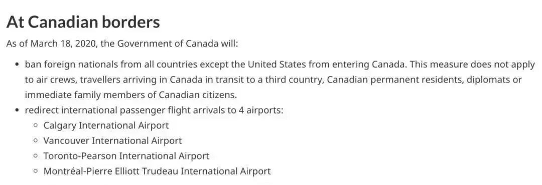 除一些例外情况,只有加拿大公民、永久居民及部分从美国来且已在美国居住至少14天的外国公民,在无感染症状情况下,可以登机前往加拿大。