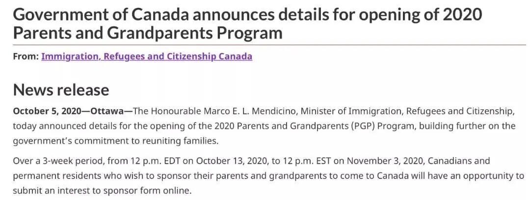 好消息终于来了! 加拿大移民部官宣,将在10月13日加拿大东部时间下午12:00至11月3日下午12:00之间开放父母团聚申请。想担保自己父母的申请人要先在网上填写意向表,然后再通过抽签的方式来决定谁可以递交申请。收到邀请函的担保申请人将有60天的时间提交完整的申请。2020年最多接受10,000个申请。2021年将开启新的担保申请流程,以便接受总共30,000个申请。 同时,移民部还推出了一项临时的人性化公共政策,考虑今年的疫情影响,对2020的担保人收入要求有所降低。2020年只需要满足加拿大最低收入要求即可,不需要在最低收入的基础上再加30%,这对很多家庭来说是一个重大利好,特别是那些由于新冠疫情而造成经济负面影响的意向申请人。 有意向要担保的小伙伴们,一定要注意好以上时间段,因为如果一旦过了截止日期而没有填表的话,则今年将没有获得抽选的机会。 意向表里的大致内容是询问担保人和被担保人的个人信息,以及担保人的家庭收入是否满足联邦规定的最低收入标准。加拿大政府最看重的一点就是担保人的家庭收入情况了,即便父母和祖父母将来获得移民身份后,联邦政府也会要求担保人承诺将会依然负担自己父母以及祖父母的经济需求长达20年。 “树欲静而风不止,子欲养而亲不待”。很多孩子在加国奋斗多年,已经成功获得移民身份。而家里的父母却一直是他们深深的牵挂。加国政府一直是全世界对于家庭团聚类别最慷慨的国家。 2020年受疫情的影响,加拿大移民系统面临前所未有的挑战,移民局在巨大的压力下依然开放父母团聚移民申请,还是值得肯定。尽管配额大幅减少。但这只是疫情影响下的临时调整,未来疫情过后加拿大的整体移民态势还将回归正常!