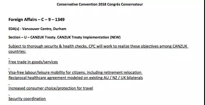 加拿大保守党昨天通过了提案,支持CANZUK(加英澳新四个国家之间公民、贸易自由流动)政策。