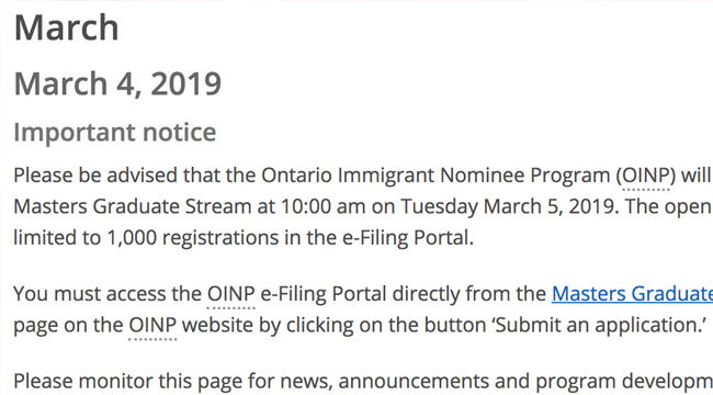 安省移民厅今天早上的最新消息,明天(3月5日,周二)上午10点,安大略省省提名项目中的硕士移民类别(Ontario Immigrant Nominee Program Masters Graduate Stream)将准时开通网上申请通道。开放名额为1000个,满额即关闭。
