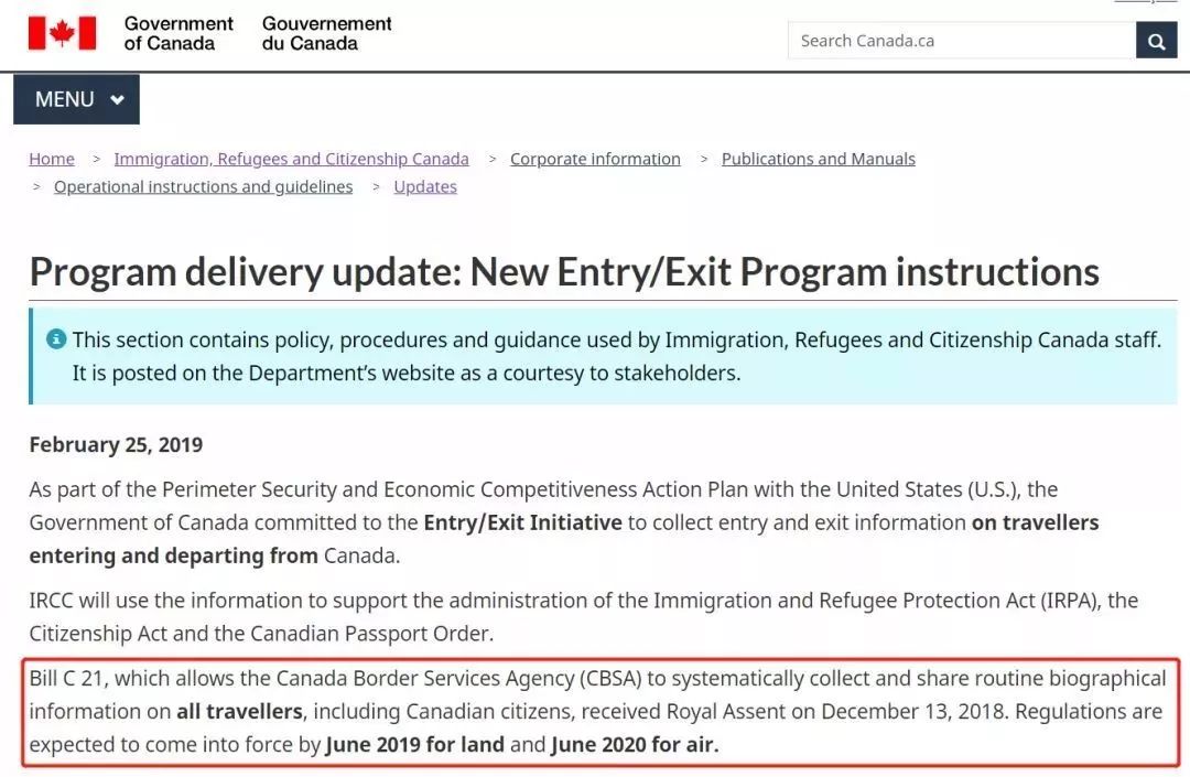 基于2018年12月13日通过的Bill C21法案,加拿大边境管理局(CBSA)即将实行收集出入境旅客的管理资料及信息。2019年6月起对陆路进出的跨境者生效,2020年6月起对航空出入境者生效。