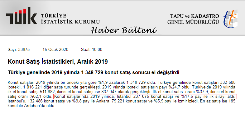 土耳其统计局官网:2019年伊斯坦布尔房屋销售量达到237675套