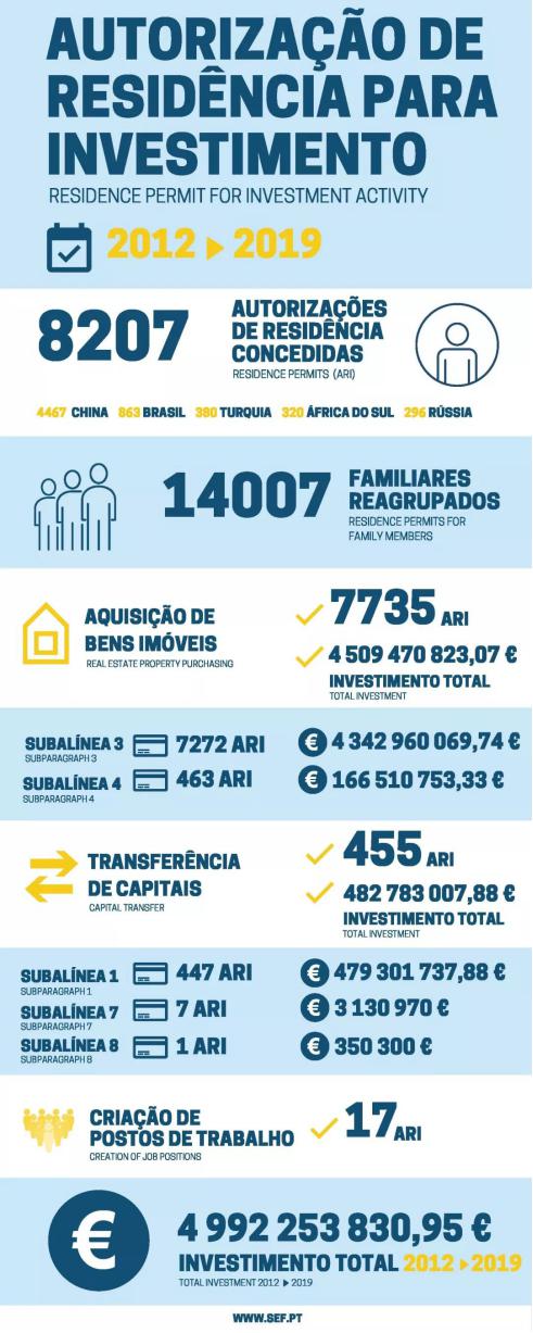 根据SEF公布的数据显示,自2012年10月8日葡萄牙黄金居留计划推出至2019年12月31日,7年间,葡萄牙黄金居留许可项目吸引的总投资额达到49.9亿欧元。其中房地产投资依旧是热门之选,投资额达到45亿欧元,占总投资额的90%。