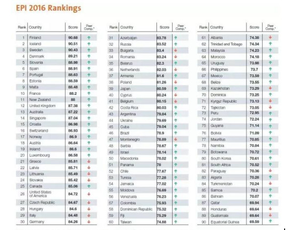 根据美国耶鲁大学和哥大联合公布的2016年环境绩效指数(EPI)显示,葡萄牙环境污染程度很低,世界排名第7。