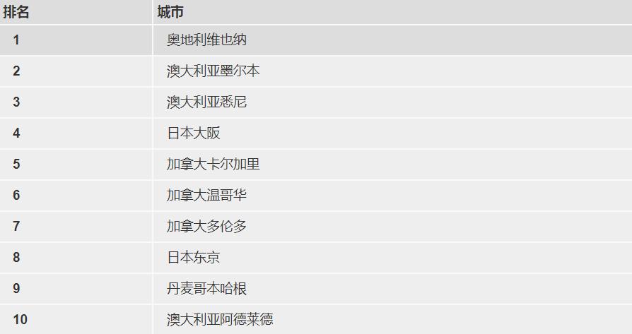 世界最宜居城市十强榜单
