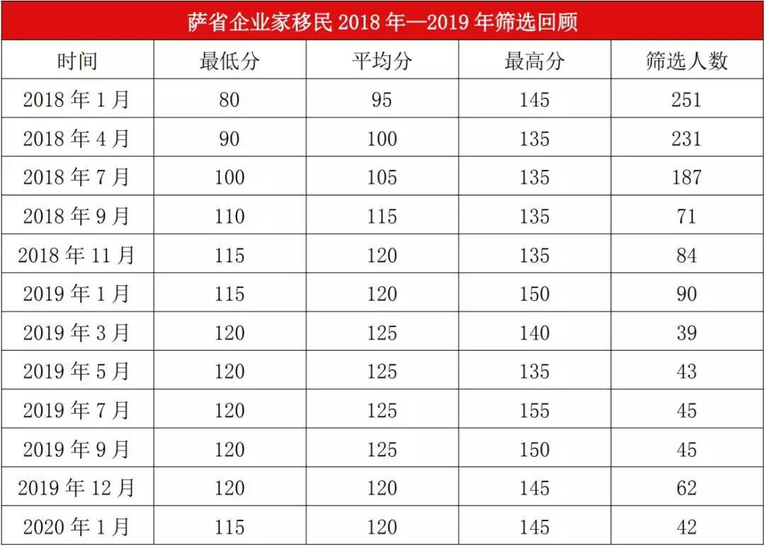 近日,从加拿大萨省移民部获悉:2020年1月8日萨省企业家移民EOI筛选分数最低115分,最高145分,平均120分,本轮筛选共计发出42份邀请。其中分数达到120分以上会被获邀,分数为115分的且语言达到CLB4会被获邀。