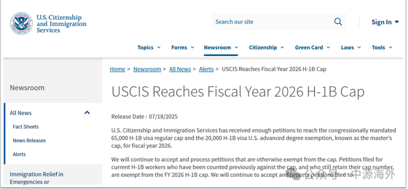 2025年7月18日,美国移民局(USCIS)正式宣布:截至到2024年6月30日,2026财年所有基于抽签中签的H-1B申请名额已被用尽。这意味着,今年将不再进行第二轮H-1B抽签。